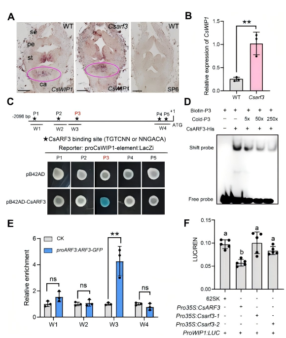 圖3. CsARF3在心皮發(fā)育過程中負(fù)向調(diào)控CsWIP1的表達(dá)