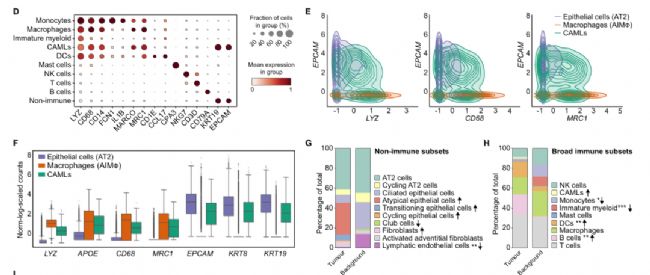 單細(xì)胞轉(zhuǎn)錄組分析鑒定出具有典型轉(zhuǎn)錄特征的多個(gè)細(xì)胞類(lèi)群,涵蓋髓系細(xì)胞、淋巴細(xì)胞以及非免疫細(xì)胞。與癌旁組織相比,腫瘤組織在免疫及非免疫細(xì)胞組成上呈現(xiàn)顯著差異。腫瘤組織中成纖維細(xì)胞與淋巴管內(nèi)皮細(xì)胞的比例顯著下降,而上皮細(xì)胞群體表現(xiàn)出更高異質(zhì)性,提示其由突變腫瘤細(xì)胞與正常細(xì)胞混合組成,且腫瘤轉(zhuǎn)化驅(qū)動(dòng)了上皮細(xì)胞狀態(tài)的多樣化。此外,腫瘤組織中單核細(xì)胞與未成熟髓系細(xì)胞比例顯著降低,而樹(shù)突狀細(xì)胞與B細(xì)胞總體比例升高。