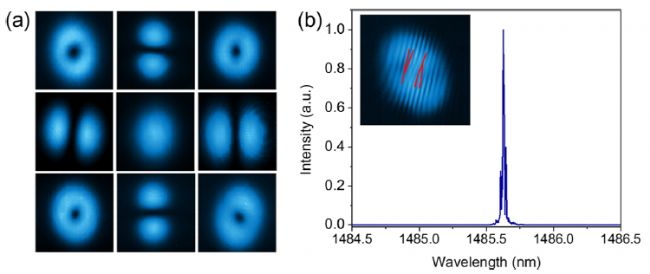 一階拉曼轉(zhuǎn)換。經(jīng)過計算和分析,我們選用了一種涂層材料,其在 1064 nm處具有高反射率,在 1485 nm處具有高透射率,在 1240 納米處具有部分透射率(小于 0.5%)。這種選擇使得輸出耦合強度低于通常在拉曼腔中使用的水平,這是出于對偏離軸向腔鏡所引入的顯著幾何損耗的考慮;它確保在實驗可行的泵浦功率條件下實現(xiàn)穩(wěn)定的高階拉曼模式生成。當獲得了拉曼激光發(fā)射后,通過一個濾波器后,使用DATARAY的LCM-1310設(shè)備,監(jiān)測最大泵浦功率下的輸出模式,同時將涂層傾斜,如圖 a 所示。在共軸腔結(jié)構(gòu)中,觀察到具有高斯強度分布的拉曼激光輸出,這標志著涂層的初始狀態(tài)(0°)。將涂層在水平和垂直平面上旋轉(zhuǎn),旋轉(zhuǎn)角度為 0.117°,光學腔的進一步對角傾斜導致了 HG1,0 和 HG0,1 模式之間的相互干擾,從而在高斯輪廓的對角線上產(chǎn)生了四個對稱分布的 LG 羅曼模式。在實驗中,當腔鏡的角度保持不變時,金剛石的特殊熱性能確保輸出模式不會隨泵浦功率而變化。如圖 b 所示。很明顯,干涉圖案表現(xiàn)出螺旋相位特征,表明具有左旋和右旋(逆時針和順時針)的旋光性。圖 c 展示了使用光譜儀收集的光譜,中心波長約為 1240 nm,滿足在 1064 納米泵浦條件下金剛石晶體的首階羅曼輸出波長的要求。
