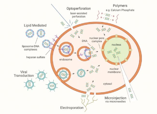 實(shí)現(xiàn)細(xì)胞轉(zhuǎn)染方式繁多,依據(jù)原理可大致分為化學(xué)法、物理法及生物法;瘜W(xué)法以脂質(zhì)體法為代表,通過(guò)利用人工合成的陽(yáng)離子脂質(zhì)體與帶負(fù)電荷的核酸自組裝形成復(fù)合物,通過(guò)細(xì)胞內(nèi)吞作用將外源核酸遞送入細(xì)胞。物理法以電穿孔法和顯微注射法為代表,通過(guò)電脈沖或壓力使細(xì)胞膜穿孔,從而將外源核酸或蛋白質(zhì)遞送入細(xì)胞。生物法則以病毒介導(dǎo)法為主,通過(guò)利用改造后的病毒(如慢病毒、逆轉(zhuǎn)錄病毒)為載體,將外源基因?qū)爰?xì)胞。