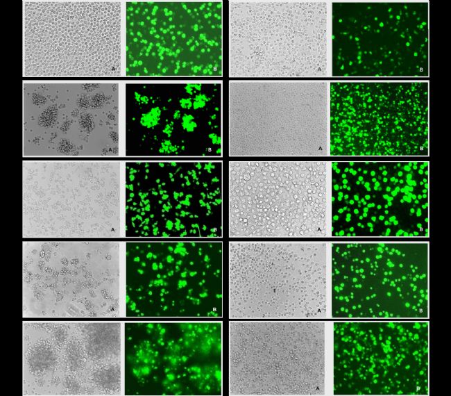 轉(zhuǎn)染免疫相關(guān)細(xì)胞案例,均以0.5μg EGFP-plasmid轉(zhuǎn)染細(xì)胞,24h后檢測(cè)熒光表達(dá)情況,結(jié)果顯示ExTransfection轉(zhuǎn)染免疫細(xì)胞能兼具轉(zhuǎn)染效率與細(xì)胞活率。