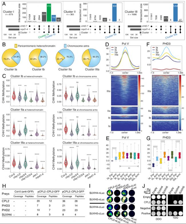 作者為了進(jìn)一步解析CPL2-PHD2/3如何支持RdDM,研究者將DMRs細(xì)分為更具體的調(diào)控類別(CMT2特異、RdDM特異等)。分析結(jié)果表明,Clusters IIa和IIIa(占Clusters II/III的75-80%)僅與nrpd1-4 DMRs重疊,而不與cmt2-7重疊(圖3A),表明這些區(qū)域完全由RdDM調(diào)控;蚪M定位顯示,Cluster Ia和Ib偏好性定位于近著絲粒異染色質(zhì),而Clusters IIa和IIIa富集于染色體臂上(圖3B)。甲基化分析揭示,clsy1/2雙突變體和shh1單突變體在所有簇中均導(dǎo)致CHH甲基化顯著降低,而clsy3/4影響有限(圖3C),表明CPL2–PHD2/3主要依賴SHH1–CLSY1/2–Pol IV分支招募Pol IV。