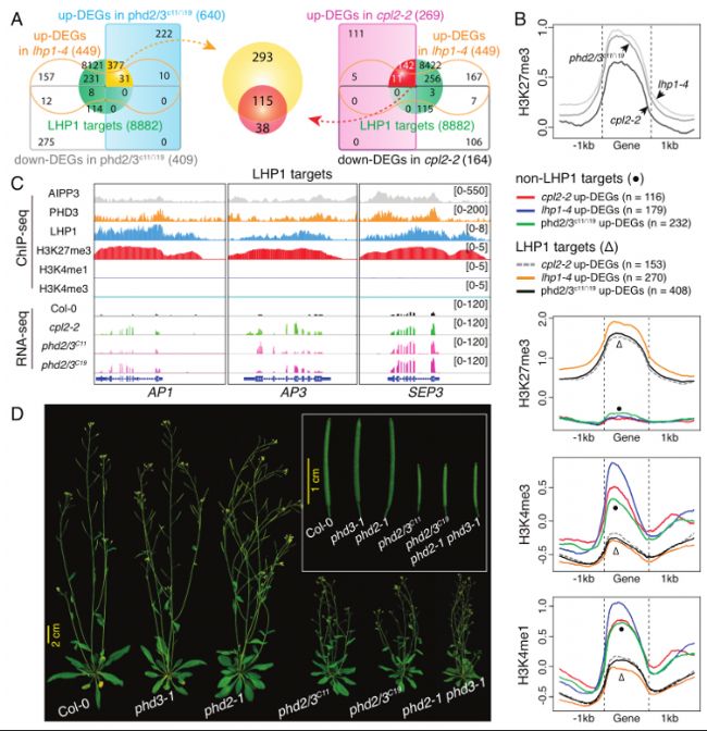 圖4:LHP1與CPL2–PHD2/3模塊物理互作,并以H3K27me3依賴方式定位于PHD2/3調(diào)控基因。