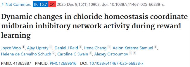 參考文獻:Woo J, Uprety A, Reid DJ, Chang I, Ketema Samuel A, de Carvalho Schuch H, Swain CC, Ostroumov A. Dynamic changes in chloride homeostasis coordinate midbrain inhibitory network activity during reward learning. Nat Commun. 2025 Dec 9;16(1):10903. doi: 10.1038/s41467-025-66838-xIF: 15.7 Q1 . PMID: 41365887; PMCID: PMC12689616.