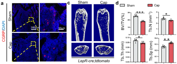 將辣椒素或載體注射到20月齡的LepR-Cre中; tdtomato小鼠1周后建立感覺神經(jīng)缺失模型,2周后處死小鼠,免疫熒光法證實感覺缺失,辣椒素處理后,與假手術(shù)組相比,辣椒素組CGRP+感覺神經(jīng)數(shù)量明顯減少(圖5a,B)。此外,與假手術(shù)組相比,辣椒素組顯示BV/TV、Tb.Th、Tb.N顯著降低,Tb.Sp增加(圖5c、d)。