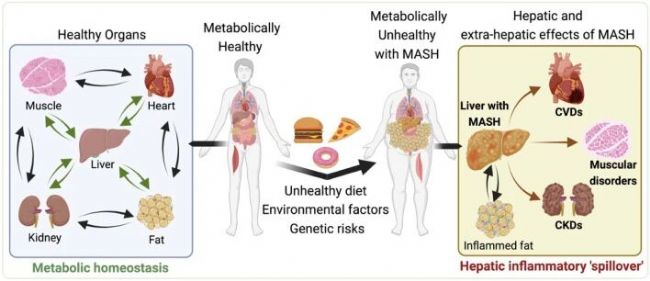 [5] Sandireddy R, Sakthivel S, Gupta P, Behari J, Tripathi M, Singh BK. Systemic impacts of metabolic dysfunction-associated steatotic liver disease (MASLD) and metabolic dysfunction-associated steatohepatitis (MASH) on heart, muscle, and kidney related diseases. Front Cell Dev Biol. 2024 Jul 16;12:1433857. doi: 10.3389/fcell.2024.1433857. PMID: 39086662; PMCID: PMC11289778.