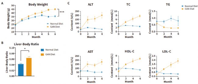 圖2. GAN飲食誘導(dǎo)(40% fat+25% fructose in calorie+2% cholesterol (g/g) for 20 weeks)C57BL/6小鼠MASH模型構(gòu)建。A. 小鼠體重曲線;B. 小鼠肝體積比變化情況;C. GAN造模后小鼠各項(xiàng)血生化指標(biāo)檢測(cè)。(***P<0.001,*P<0.05)