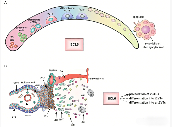 1. 調(diào)控增殖與分化:BCL6促進(jìn)細(xì)胞滋養(yǎng)層的增殖與存活,同時(shí)抑制其向合體滋養(yǎng)層的分化與融合過程。