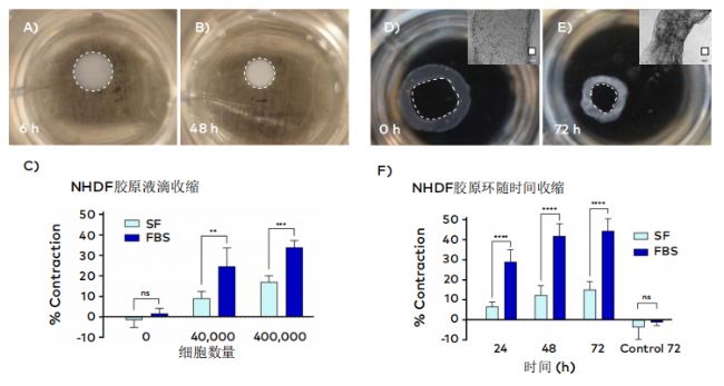 試驗(yàn)選用新生兒人真皮成纖維細(xì)胞(NHDFs),搭配CELLINK高純度1型膠原蛋白作為生物墨。液滴樣本分別混合0、40,000、400,000個(gè)細(xì)胞,環(huán)形樣本則混合100萬個(gè)細(xì)胞(含無細(xì)胞對照組),分別在有血清(FBS)和無血清(SF)培養(yǎng)基中培養(yǎng)48-72小時(shí),全程監(jiān)測收縮率與細(xì)胞活力。