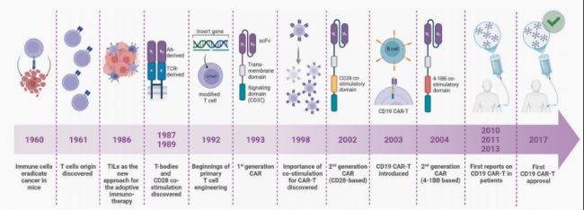 圖1. CAR-T細(xì)胞研發(fā)里程碑時間線[1]。