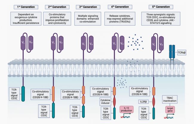 結(jié)構(gòu):二代基礎(chǔ)上添加可分泌元件(如IL-12、趨化因子);