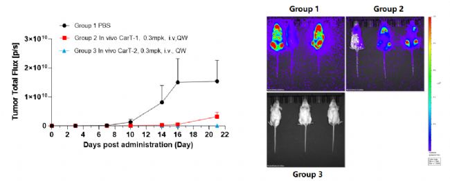 在M-NSG小鼠中,通過移植人PBMC成功重建免疫系統(tǒng),并建立Nalm6-Luc人B淋巴白血病模型。結(jié)果顯示,給予In vivo CAR-T治療后,腫瘤生長被顯著抑制。
