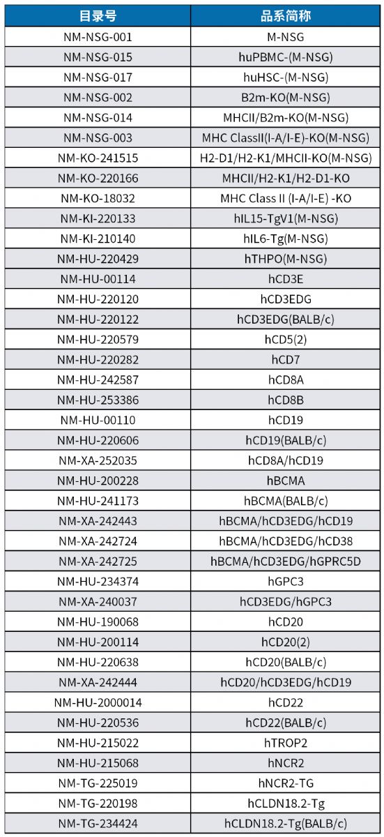 南模生物針對CAR-T藥物研究的常見靶點自主研發(fā)了多種人源化動物模型,助力CAR-T藥物的臨床前研究,模型信息詳見下表,歡迎咨詢。