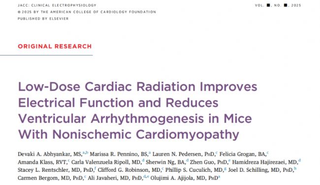 基于此,加州大學(xué)洛杉磯分校醫(yī)學(xué)系心臟病學(xué)部Olujimi A. Ajijola團(tuán)隊(duì)在JACC-Clinical Electrophysiology發(fā)表題為“Low-Dose Cardiac Radiation Improves Electrical Function and Reduces Ventricular Arrhythmogenesis in Mice With Nonischemic Cardiomyopathy”的研究論文。