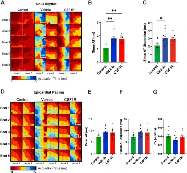 本研究為驗(yàn)證巨噬細(xì)胞耗竭是否復(fù)刻5Gy心臟RT對(duì)NICM心室電生理的影響,對(duì)ACSL1TG小鼠進(jìn)行6周CSF1R抗體腹腔注射(巨噬細(xì)胞耗竭),結(jié)果顯示:該處理可顯著改善小鼠心室功能(射血分?jǐn)?shù)、短軸縮短率升高,心臟重量 / 體重比降低),但對(duì)心室激活、傳導(dǎo)速度等電生理指標(biāo)無(wú)明顯影響,表明巨噬細(xì)胞耗竭僅能改善NICM的心室功能,不影響其致心律失常性。