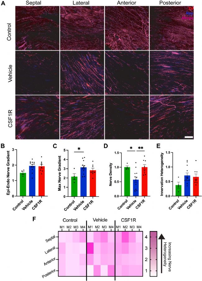 本研究探究CSF1R抗體治療(限制巨噬細(xì)胞募集)對(duì)NICM的影響:經(jīng)去甲腎上腺素誘導(dǎo)心律失常后,其與溶劑對(duì)照組小鼠的室性早搏發(fā)生情況無(wú)顯著差異,未能減少室性心律失常;對(duì)交感神經(jīng)的量化分析顯示,該治療僅部分保護(hù)左心室交感神經(jīng)支配(神經(jīng)密度較對(duì)照組改善),但心外膜至心內(nèi)膜的神經(jīng)支配跨壁梯度及空間異質(zhì)性均無(wú)明顯變化。