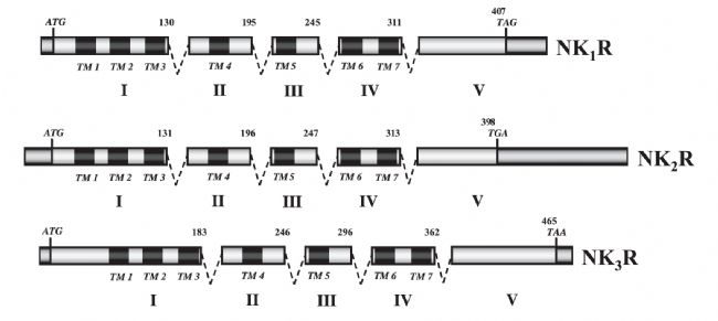NK1、NK2和NK3受體在結(jié)構(gòu)上具有高度同源性,同屬于 G蛋白偶聯(lián)受體超家族。它們擁有共同的核心結(jié)構(gòu)特征:七次跨膜螺旋結(jié)構(gòu)、細胞外域、細胞內(nèi)域。