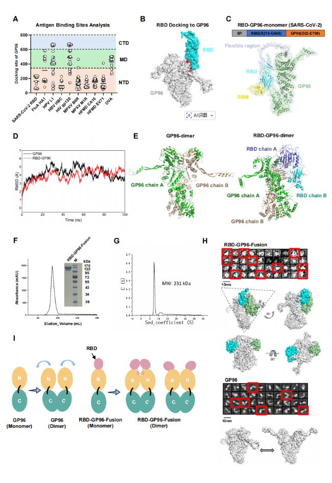圖1. 抗原-GP96融合策略的結(jié)構(gòu)引導(dǎo)性設(shè)計(jì)和關(guān)鍵結(jié)構(gòu)的特性:以RBD-GP96融合為例