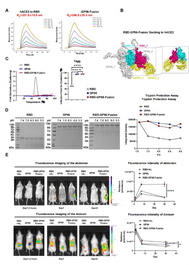 關(guān)鍵的是,融合設(shè)計(jì)并未損害抗原本身的生物學(xué)功能。表面等離子共振和ELISA實(shí)驗(yàn)表明,RBD-GP96-Fusion與宿主受體hACE2的結(jié)合親和力與天然的RBD二聚體相當(dāng),證明RBM表位被完整保留并充分暴露(圖2A, B)。更重要的是,融合顯著提升了抗原的物理穩(wěn)定性和抗酶解能力。納米差示掃描熒光法顯示,融合蛋白的熱聚集溫度顯著高于單獨(dú)的RBD(圖2C);胰蛋白酶保護(hù)實(shí)驗(yàn)證明,GP96的存在使融合蛋白在酸性環(huán)境下更能抵抗酶切降解(圖2D)。這種增強(qiáng)的穩(wěn)定性直接轉(zhuǎn)化為了優(yōu)異的體內(nèi)滯留性:活體成像顯示,皮下注射后,RBD-GP96-Fusion在注射部位和引流淋巴結(jié)中的熒光信號滯留時(shí)間遠(yuǎn)超單獨(dú)的RBD或GP96,表現(xiàn)出明顯的“抗原庫”效應(yīng)(圖2E)。