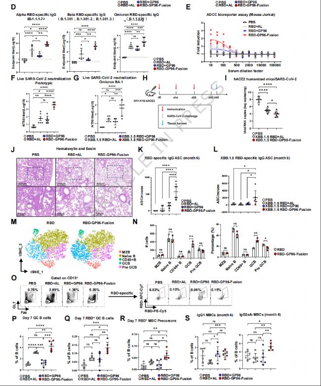 圖3. RBD-GP96-Fusion疫苗誘導(dǎo)IgG滴度魯棒性與GC B細(xì)胞強(qiáng)烈的抗原特異性響應(yīng)