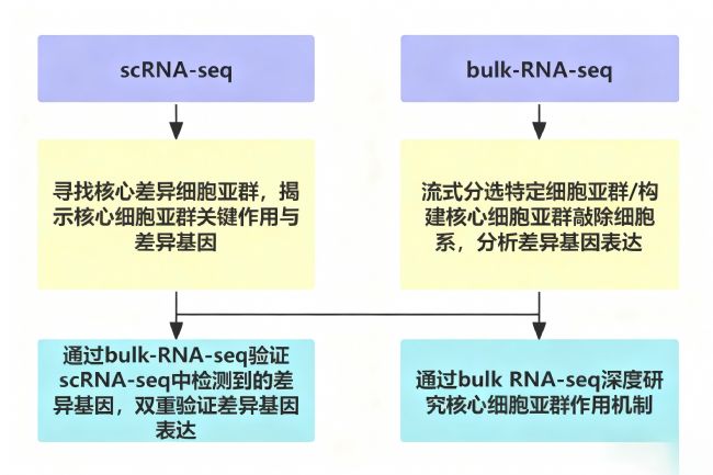 Bulk RNA-seq與單細(xì)胞轉(zhuǎn)錄組測序(scRNA-seq)的整合應(yīng)用,已成為當(dāng)前生命科學(xué)領(lǐng)域解析復(fù)雜生物學(xué)問題的核心研究策略。Bulk RNA-seq聚焦組織或細(xì)胞群體的整體表達(dá)水平,具備測序深度深、基因覆蓋度廣、數(shù)據(jù)穩(wěn)定性高的優(yōu)勢,可高效獲取樣本全局轉(zhuǎn)錄組特征;scRNA-seq則突破群體平均表達(dá)的局限,以單細(xì)胞分辨率精準(zhǔn)解析細(xì)胞異質(zhì)性,清晰界定不同細(xì)胞亞群的轉(zhuǎn)錄組差異及功能特性。二者的協(xié)同聯(lián)用可實(shí)現(xiàn)技術(shù)優(yōu)勢互補(bǔ):Bulk RNA-seq為研究提供宏觀轉(zhuǎn)錄組背景框架與核心表達(dá)趨勢,scRNA-seq則完成目標(biāo)基因或通路的細(xì)胞類型級精準(zhǔn)定位,不僅能通過交叉驗(yàn)證提升實(shí)驗(yàn)結(jié)果的可靠性與重復(fù)性,更可從“群體-單細(xì)胞”雙維度層層遞進(jìn),深化對生物學(xué)過程調(diào)控機(jī)制的系統(tǒng)認(rèn)知,為后續(xù)功能驗(yàn)證及轉(zhuǎn)化研究筑牢數(shù)據(jù)根基。