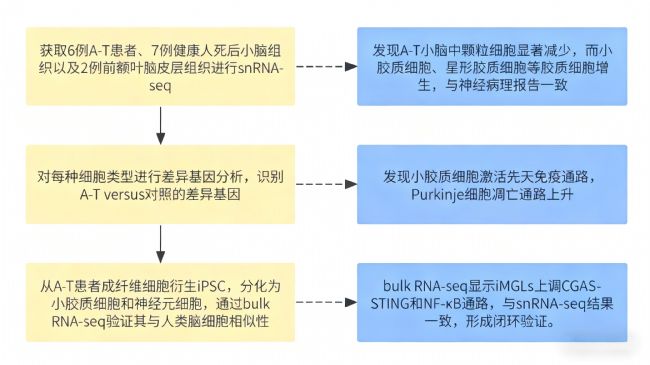 本研究創(chuàng)新性整合單核RNA測序(snRNA-seq)與Bulk轉(zhuǎn)錄組分析技術(shù),系統(tǒng)解析了ATM缺陷介導(dǎo)共濟(jì)失調(diào)毛細(xì)血管擴(kuò)張癥(A-T)小腦退化的細(xì)胞特異性機(jī)制。此前基于Bulk轉(zhuǎn)錄組的研究雖已揭示A-T患者腦組織整體基因表達(dá)譜的紊亂特征,但受限于群體平均表達(dá)水平的檢測模式,無法精準(zhǔn)區(qū)分不同細(xì)胞類型的特異性轉(zhuǎn)錄組變化,難以闡明病變的細(xì)胞起源。為此,本研究通過snRNA-seq技術(shù)構(gòu)建了人類小腦及前額葉皮層的高分辨率單細(xì)胞轉(zhuǎn)錄組圖譜,成功注釋出浦肯野細(xì)胞、顆粒細(xì)胞及小膠質(zhì)細(xì)胞等中樞神經(jīng)系統(tǒng)核心細(xì)胞類型。