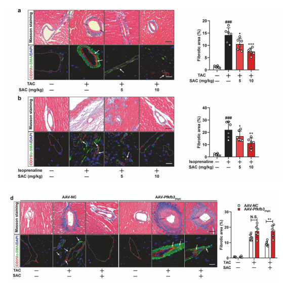 ②兼容多靶點(diǎn)共染:實(shí)驗(yàn)需同時(shí)檢測(cè) 3 種不同靶點(diǎn)(CD31、α-SMA、PFKFB3),BSA 的惰性分子結(jié)構(gòu)不會(huì)與熒光染料(Alexa Fluor 488/555)發(fā)生相互作用,也不干擾抗體與抗原的特異性結(jié)合,最終實(shí)現(xiàn) “單切片多標(biāo)志物共定位” 的高分辨率檢測(cè),為驗(yàn)證 “SAC 通過(guò)下調(diào) PFKFB3 抑制 EndoMT” 提供了直接的形態(tài)學(xué)證據(jù)(圖 a、b、d)。