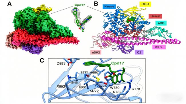 研究團(tuán)隊(duì)通過冷凍電鏡技術(shù)解析了三種Y型配體與全長PI3Kα復(fù)合物的高分辨率結(jié)構(gòu)。這些配體采用獨(dú)特的結(jié)合模式,其中一條側(cè)鏈插入由精氨酸770和色氨酸780形成的“三明治”型口袋,通過π-π堆積和陽離子-π相互作用與酶緊密結(jié)合。另一條側(cè)鏈則以特定角度插入ATP結(jié)合位點(diǎn),與催化結(jié)構(gòu)域形成豐富的疏水相互作用。