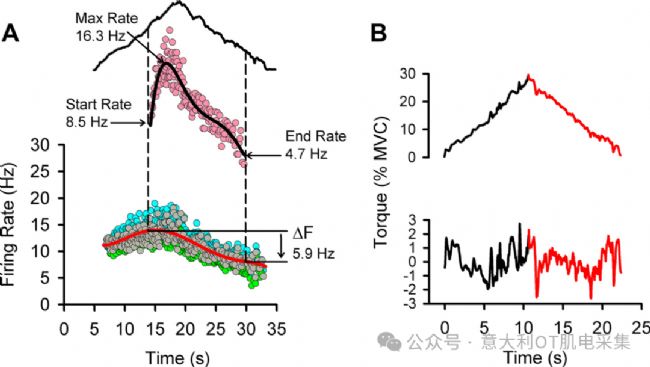 研究共招募36名健康參與者,分為年輕女性(12.1±2.8歲)、年輕男性(12.0±3.0歲)、年長(zhǎng)女性(22.0±3.2歲)和年長(zhǎng)男性(23.1±3.8歲)。參與者坐姿固定,使用定制等長(zhǎng)肌力計(jì)進(jìn)行脛骨前肌三角收縮任務(wù),收縮強(qiáng)度分別為10%、20%和30%最大自愿收縮力。肌電信號(hào)采集使用意大利OT Bioelettronica公司的高密度表面肌電矩陣(型號(hào):GR08MM1305),該矩陣包含64個(gè)電極,排列為5列×13行,電極間距8 mm,貼附于脛骨前肌肌腹。信號(hào)經(jīng)Quattrocento放大器(OT Bioelettronica)放大、濾波(10–900 Hz)后,以2048 Hz采樣率記錄。扭矩信號(hào)通過(guò)應(yīng)變傳感器同步采集。運(yùn)動(dòng)單位分解采用盲源分離算法,僅保留輪廓值≥0.85的單位進(jìn)行后續(xù)分析。通過(guò)復(fù)合運(yùn)動(dòng)單位分析技術(shù)計(jì)算ΔF,并提取起始、最大、結(jié)束放電頻率及放電間隔變異系數(shù)等參數(shù)。統(tǒng)計(jì)方法采用t檢驗(yàn)、Mann-Whitney檢驗(yàn)和雙因素方差分析。