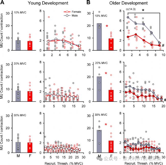 運(yùn)動(dòng)神經(jīng)元興奮性(ΔF):女性在兩年齡組中均表現(xiàn)出比男性更大的ΔF,尤其在20%和30% MVC時(shí)差異顯著(圖4)。該差異在控制運(yùn)動(dòng)單位招募閾值后依然存在。