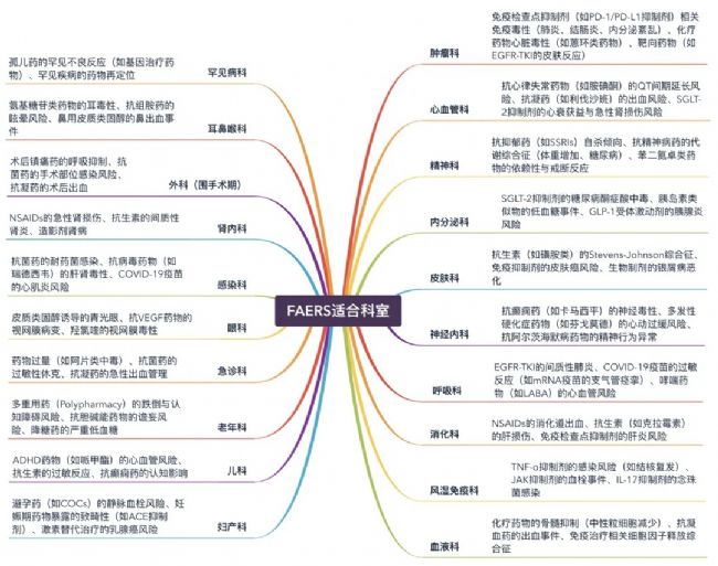 FAERS數(shù)據(jù)庫(kù)作為藥物警戒研究的關(guān)鍵工具,其數(shù)據(jù)具有廣泛的適用性,幾乎涵蓋所有臨床醫(yī)學(xué)及藥學(xué)相關(guān)學(xué)科領(lǐng)域,可供相關(guān)領(lǐng)域的專業(yè)研究者開展藥品安全性評(píng)價(jià)和風(fēng)險(xiǎn)信號(hào)挖掘工作。下圖直觀展示了其主要適用科室的范圍。