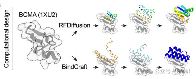 經(jīng)典的CAR-T中是使用scFv識別結(jié)合抗原,作者計(jì)劃設(shè)計(jì)蛋白結(jié)合分子(binder)用在CAR-T上,兩條AI設(shè)計(jì)路線,一條用RFDiffusion,另一條用BindCraft(相關(guān)文章我們都分享過)