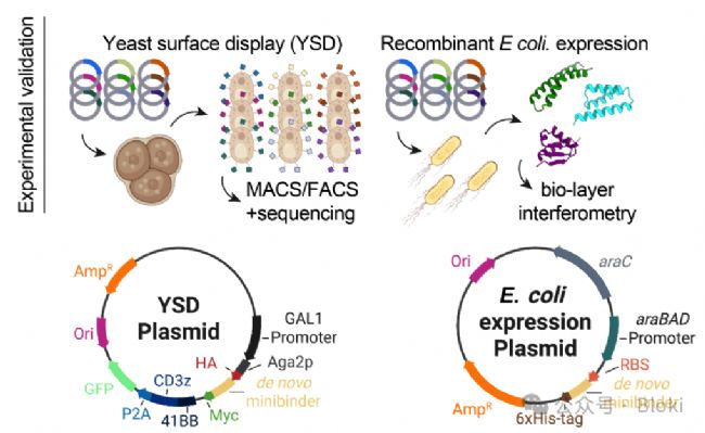 AI設(shè)計(jì)、虛擬篩選后,進(jìn)行實(shí)際篩選:酵母展示-流式檢測-磁珠分選-測序-大腸桿菌表達(dá)-實(shí)際驗(yàn)證binder和靶蛋白的互作