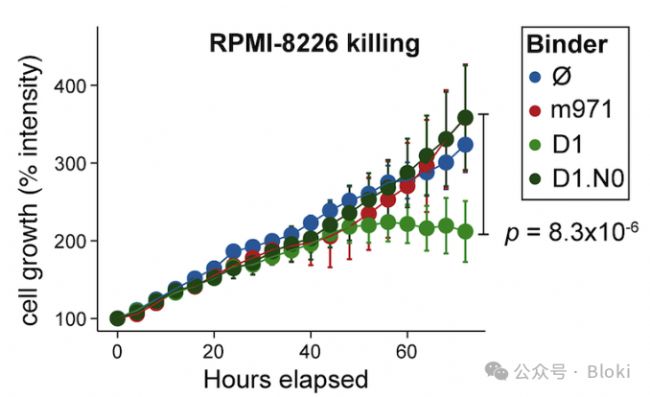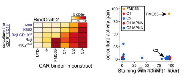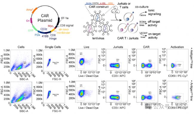 把設(shè)計(jì)出的新binder做成CAR-T,CAR-T對熒光標(biāo)記的BCMA結(jié)合情況、響應(yīng)細(xì)胞刺激激活情況(可以看到有的CAR-T自身就會發(fā)生激活,還會響應(yīng)BCMA陰性細(xì)胞發(fā)生激活,暗示有的binder介導(dǎo)CAR-T自發(fā)信號tonic signaling)