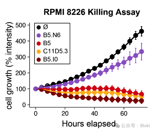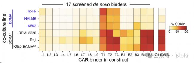基于不同binder的CAR-T對細(xì)胞的響應(yīng)情況,可以看到有的binder(如T1、T2、T3)對BCMA陰性細(xì)胞也會響應(yīng)發(fā)生激活(CD69指示激活,C11D5.3是經(jīng)典的scFv)