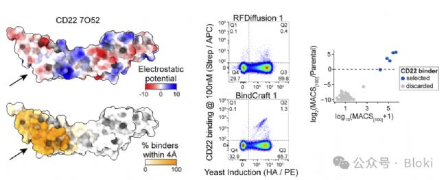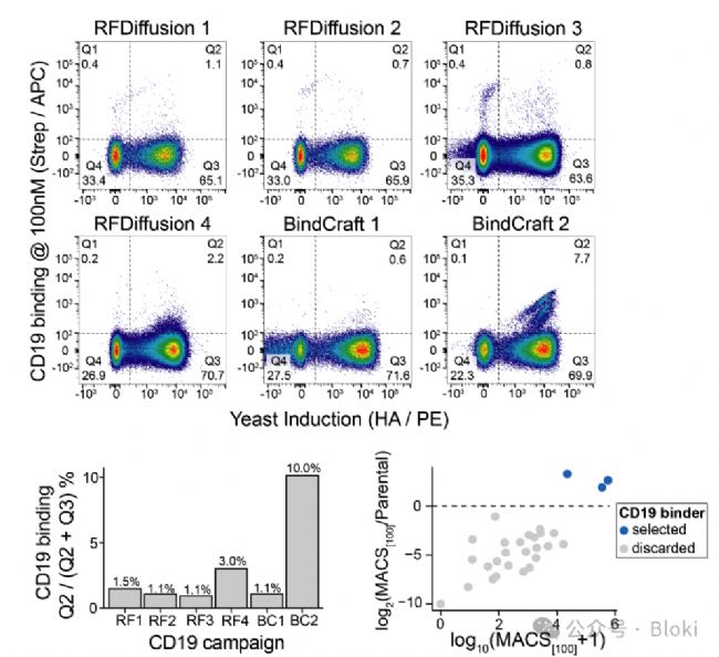 把AI虛擬篩出的bidner展示在酵母上,熒光標(biāo)記的靶蛋白“染色”酵母,檢測實(shí)際結(jié)合靶蛋白BCMA的binder(作者發(fā)現(xiàn)BindCraft設(shè)計(jì)命中率更高)