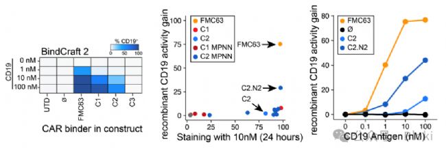 換靶點(diǎn),設(shè)計(jì)結(jié)合CD19的binder:FMC63(一個(gè)經(jīng)典的scFV)、CD81結(jié)合在CD19上不同位點(diǎn)
