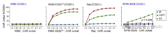 把binder做成CAR-T,CAR-T結(jié)合CD22,響應(yīng)細(xì)胞激活;發(fā)現(xiàn)不好的結(jié)果,基于binder D1的CAR-T響應(yīng)CD22陰性細(xì)胞發(fā)生了激活