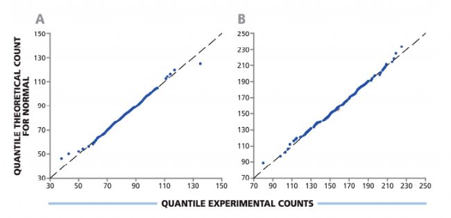 384孔板重復(fù)孔的點計數(shù)變異符合正態(tài)分布。 PBMC 接種于:(A)384個重復(fù)孔,每孔0.5×10⁵個細胞;(B)192個重復(fù)孔,每孔1.0×10⁵個細胞。采用 IFN - γ 斑點試驗檢測 HCMV pp65抗原的反應(yīng)。通過Shapiro-Wilk檢驗(α 值0.05,p值分別為0.708和0.388)確認數(shù)據(jù)正態(tài)性。實驗計數(shù)與理論計數(shù)的Q-Q圖如圖所示。