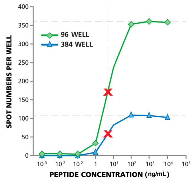 當抗原進行系列稀釋時,通常無需設(shè)置重復(fù)孔,因為連續(xù)抗原濃度的系列孔可確認陽性反應(yīng)。384孔板格式的功能親和力測定,所需 PBMC 量可與常規(guī)96孔板單次抗原劑量測定相同或更少。在常規(guī)96孔板檢測中,單次抗原劑量下以每孔3×10⁵ PBMC 進行三重復(fù)孔抗原反應(yīng)性測試,需9×10⁵ PBMC 外加等量培養(yǎng)基對照 PBMC(即1.8×10⁶ PBMC)。而在對應(yīng)的384孔板格式中,細胞接種密度為每孔1.0×10⁵個;使用1.8×10⁶ PBMC 時,可額外設(shè)置15個孔用于劑量反應(yīng)曲線測試(其中3個孔分配給培養(yǎng)基對照),從而獲取關(guān)于T細胞反應(yīng)親和力的寶貴補充信息。