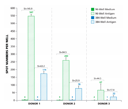 96孔板與384孔板的信噪比性能對比。圖中展示了 HCMV pp65抗原誘導(dǎo)反應(yīng)(斜線柱狀圖)及培養(yǎng)基對照(實心柱狀圖——多數(shù)因尺寸過小無法顯示)在三位供體高、中、低反應(yīng)水平下的表現(xiàn)。96孔板 PBMC 數(shù)為3×10⁵,384孔板為1.0×10⁵。各條件下三個重復(fù)孔的平均斑點計數(shù)/孔值標注于柱狀圖上方。刺激指數(shù)(SI)定義為抗原誘導(dǎo)的ELISPOT數(shù)除以培養(yǎng)基背景中的斑點數(shù)。對應(yīng)培養(yǎng)基對照/抗原配對的SI值已明確標注。