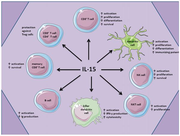 IL-15通過激活下游多條信號通路,對多種免疫細胞發(fā)揮關(guān)鍵的生物學效應,主要體現(xiàn)在以下四個方面: