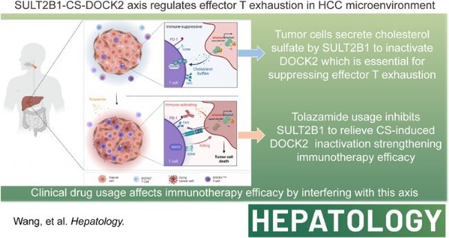綜上所述,本研究揭示DOCK2是調(diào)控HCC中CD8⁺ T細(xì)胞浸潤(rùn)的關(guān)鍵因子,而腫瘤細(xì)胞通過SULT2B1合成硫酸膽固醇,進(jìn)而促使效應(yīng)T細(xì)胞發(fā)生耗竭。這一發(fā)現(xiàn)提示,靶向SULT2B1-CS-DOCK2信號(hào)軸可能為改善HCC免疫治療療效提供新的干預(yù)策略。