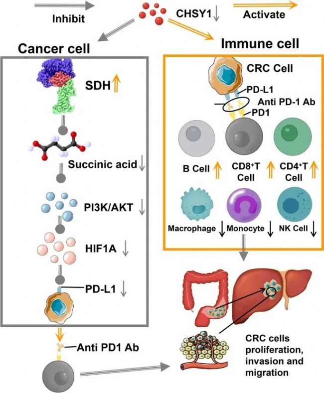在轉(zhuǎn)化應(yīng)用層面,研究證實(shí)青蒿素作為CHSY1活性抑制劑,能夠顯著抑制肝轉(zhuǎn)移、增強(qiáng)抗PD-1療法的療效。進(jìn)一步構(gòu)建的PLGA包裹青蒿素聯(lián)合ICG探針的遞送系統(tǒng),有效降低了肝轉(zhuǎn)移負(fù)荷,提升了抗PD-1治療CRC的效果。綜合機(jī)制表明,CHSY1通過激活琥珀酸代謝及下游PI3K/AKT/HIF-1α信號(hào)通路,促進(jìn)CD8⁺ T細(xì)胞耗竭,從而驅(qū)動(dòng)CRC肝轉(zhuǎn)移。