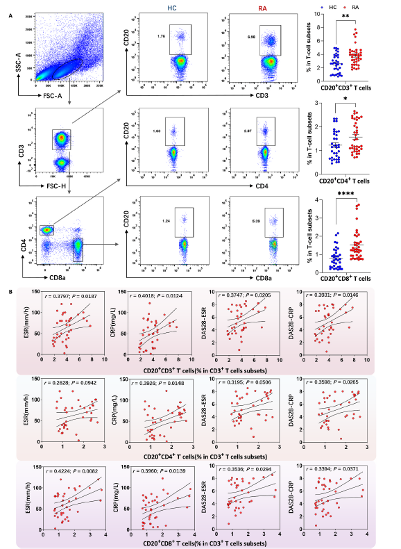 Fig 1. RA患者外周血CD20+ CD3+T細胞水平高于HC患者,并與疾病活動性和全身炎癥相關(guān)