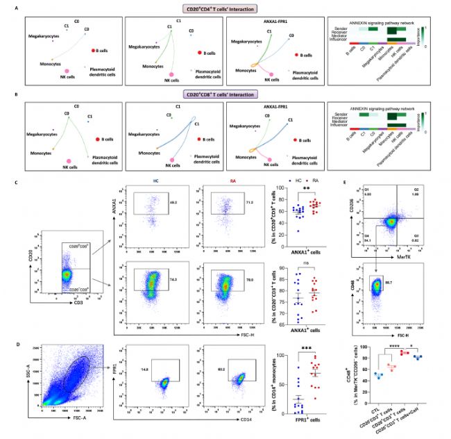 為驗證上述預(yù)測,研究者建立了自體共培養(yǎng)體系,將RA患者來源的CD14+單核細胞與CD20+ CD3+T細胞共培養(yǎng)。結(jié)果顯示,與CD20−CD3+T細胞相比,CD20+ CD3+T細胞能顯著促進單核細胞向具有MerTK+CD206-CD48+ 表型的促炎巨噬細胞分化,該表型與RA滑膜組織中浸潤的病理型巨噬細胞高度相似。加入FPR1抑制劑環(huán)孢素H后,這種促炎分化效應(yīng)被顯著抑制,證實ANXA1-FPR1信號在該過程中的關(guān)鍵作用。