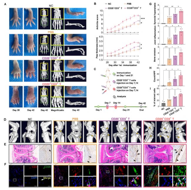 4. CD20+ CD3+T細胞過繼轉(zhuǎn)移加重CIA小鼠關(guān)節(jié)炎進展