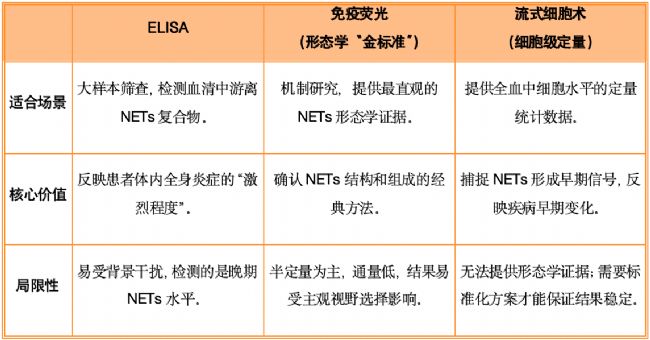 目前主流的NETs檢測方法各有側(cè)重,優(yōu)質(zhì)研究往往采用“組合策略”: