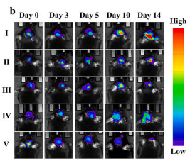 文章中,作者采用廣州博鷺騰 AniView 動物活體成像系統(tǒng),結(jié)合小鼠模型評估了 BAA-HA 對原位膠質(zhì)母細(xì)胞瘤的抗腫瘤療效,整個治療周期為 14 天,實(shí)驗(yàn)共設(shè)置五組::(I)PBS+US+激光,(II)BAA-HA,(III)BAA-HA +激光,(IV)BAA-HA + US,以及(V)BAA-HA+US+激光。在第0、3、5、10和14天使用生物發(fā)光成像監(jiān)測腫瘤進(jìn)展。結(jié)果顯示,與其它組相比,V組的腫瘤生物發(fā)光強(qiáng)度顯著降低。I組和II組的腫瘤抑制效果幾乎可以忽略不計,而III組和IV組則表現(xiàn)出中等程度的治療效果。
