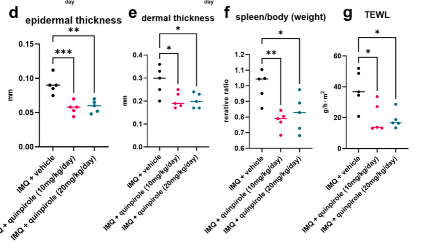 - 喹吡羅或利培酮對(duì)咪喹莫特(IMQ)誘導(dǎo)的小鼠銀屑病的影響研究:采用IMQ誘導(dǎo)的銀屑病小鼠模型,連續(xù)5天在小鼠剃毛的背部皮膚局部涂抹IMQ,同時(shí)腹腔注射DRD2激動(dòng)劑喹吡羅或拮抗劑利ASCH VAPOSCAN經(jīng)皮水分流失測(cè)量?jī)x檢測(cè)經(jīng)表皮水分流失值(TEWL)。